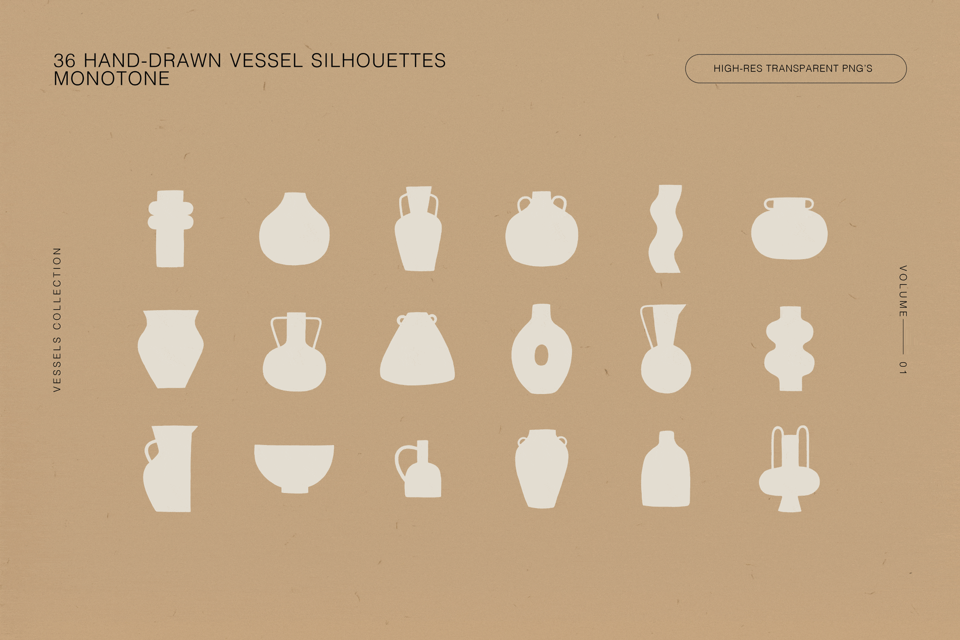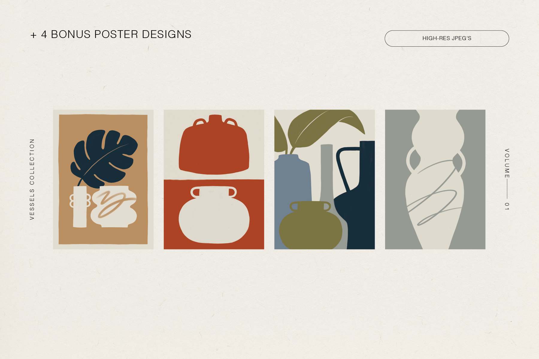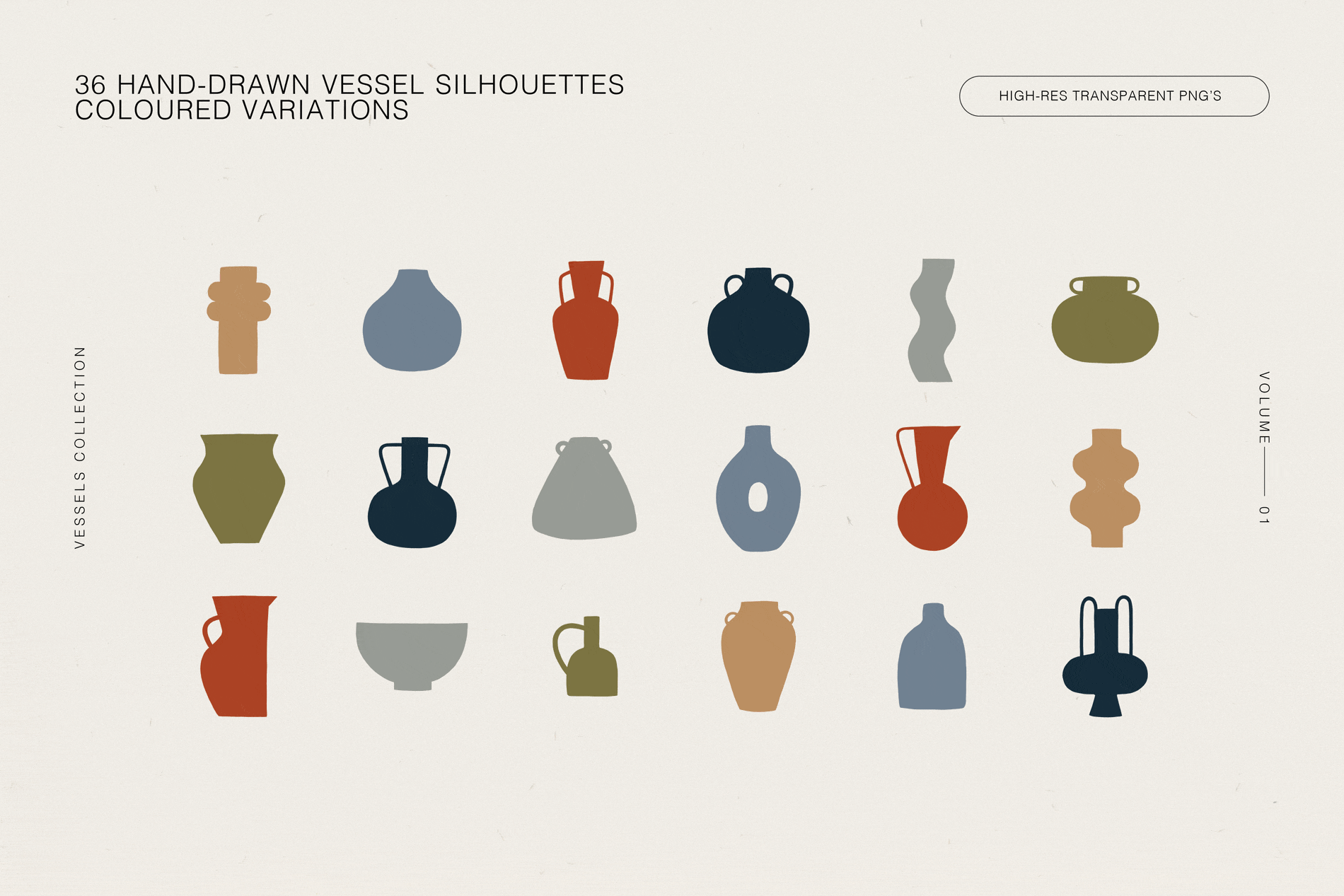 Vessels is a collection of hand-drawn vessels, vases and pots with bespoke poster designs, perfect for branding, pattern-making, personal wall art, social media marketing and more.
